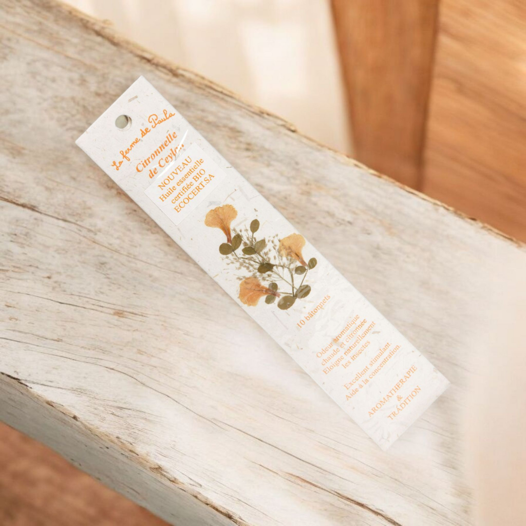 Découvrez une gamme d'encens unique, élaborée à partir de matières premières 100% naturelles et amalgamées avec un extrait de suc de cannelier. Chaque bâtonnet est le fruit d'un savoir-faire artisanal exceptionnel, garantissant une qualité et un parfum Citronnelle de Ceylan inégalés.