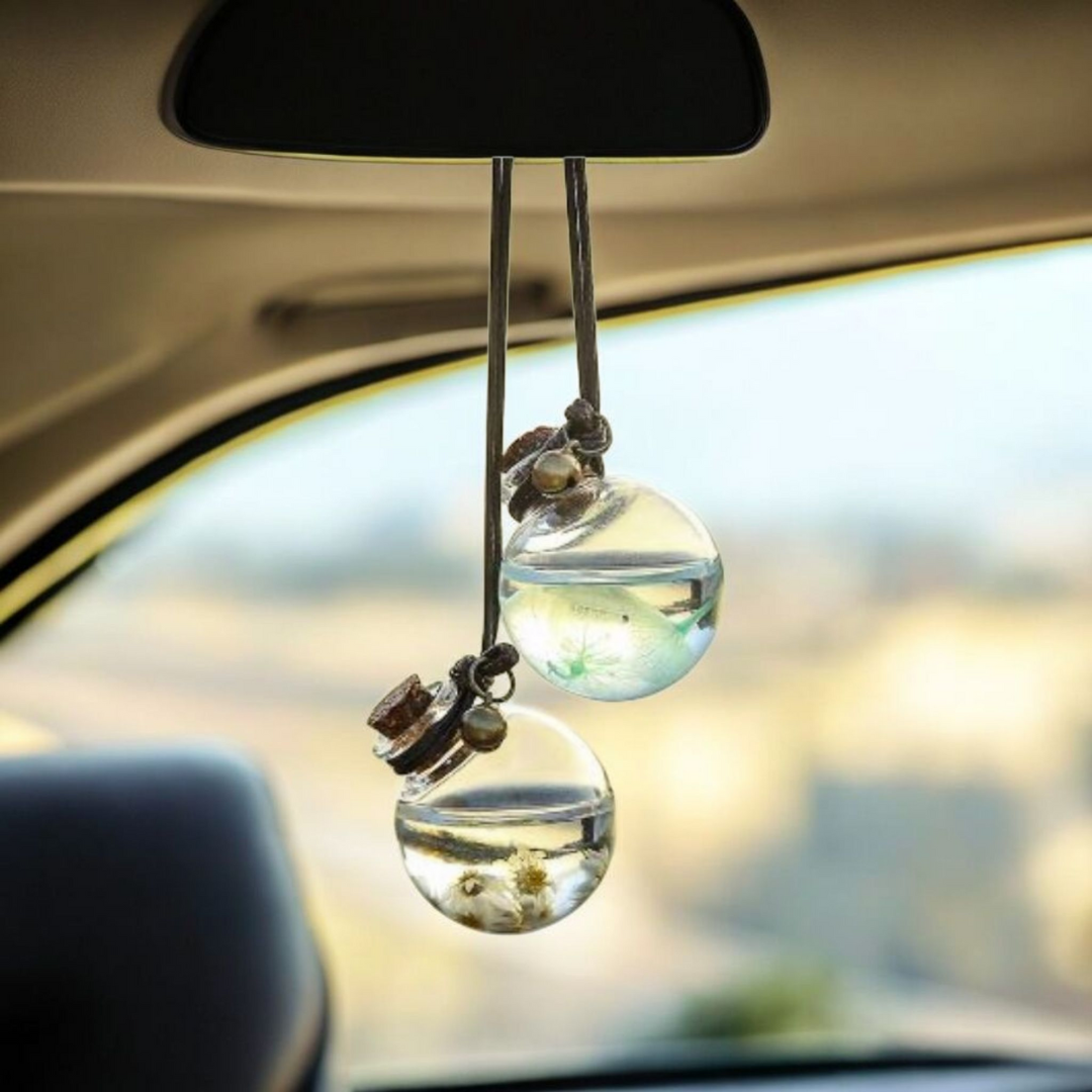 Le diffuseur de parfum de voiture Bulle se distingue par son design soigné et élégant. Le flacon en verre, tel une sphère précieuse, renferme votre fragrance favorite et quelques petites fleurs séchées. Le bouchon en liège apporte une touche naturelle et authentique, tandis que le grelot en métal émet un tintement discret et charmant à chaque mouvement.